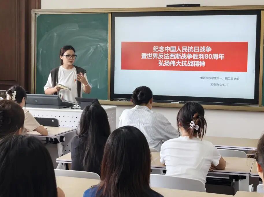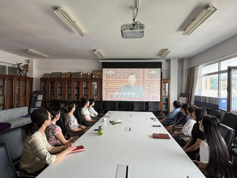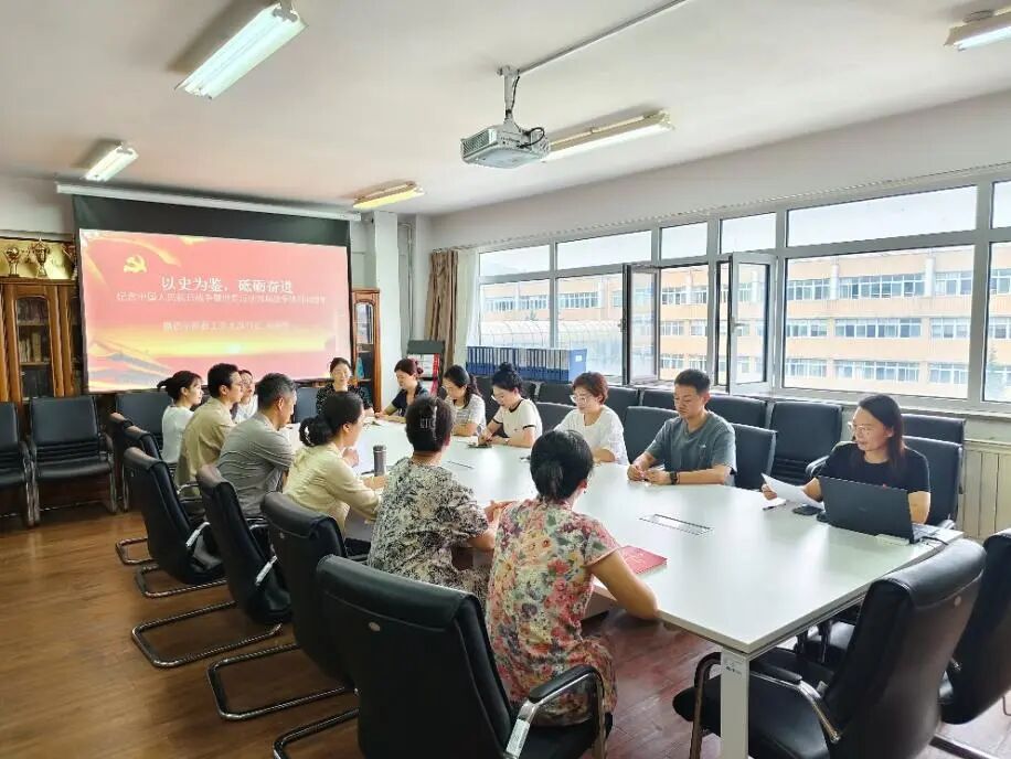 各党支部分别组织党员开展集体学习。教工党支部书记刘艳春以“以史为鉴,砥砺奋进”为主题讲授专题党课,她带领支部党员集体学习了《人民日报》文章《正义必胜 和平必胜 人民必胜——写在中国人民抗日战争暨世界反法西斯战争胜利80周年之际》,阐释了为什么“正义必胜!和平必胜!人民必胜!”是历史昭示的伟大真理,强调要从历史中汲取力量,聚焦教学科研,勇担育人使命,助力加快推进强国建设、民族复兴的历史进程。随后,教工党员集体学习习近平主席在“上海合作组织+”会议上的重要讲话,并观看专题纪录片《胜利日 纪念中国人民抗日战争暨世界反法西斯战争胜利80周年》。党员们纷纷表示,要铭记历史,缅怀先烈,传承和弘扬伟大抗战精神,以更加饱满的热情投入到教育教学工作中。