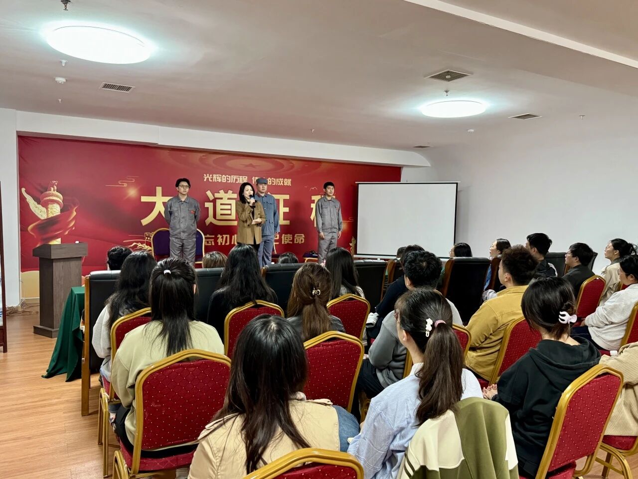 随后,全体党员沉浸式体验了《大道征程》主题党课。党课采用“理论研学+情景互动”的模式,将大连地方党史与党的二十大精神紧密结合,通过《红色电波》《把一切献给党》《760:时代楷模》三幕舞台剧表演,生动再现了从隐蔽战线的无声守护、建新公司军工事业的英勇奉献,到新时代科研工作者捍卫国家核心装备的使命担当,让党员们在沉浸体验中进一步坚定理想信念、筑牢思想根基。