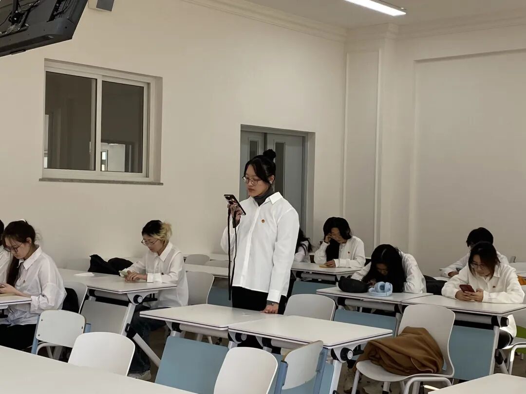 仪式在雄壮的国歌声中拉开序幕。张馨月同学宣读了新发展团员名单。本批次共有17名同学经过严格培养、考察与审核,光荣地加入了中国共产主义青年团。在热烈的掌声中,新团员们逐一佩戴上闪耀的团徽。这不仅仅是一枚徽章,更是一份沉甸甸的责任与使命。全体新团员紧握右拳,面向团旗庄严宣誓,誓词响彻会场。