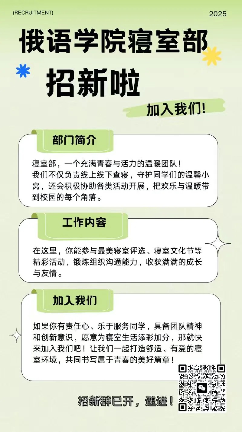 嗨!2025级的俄语小萌新们,崭新的大学生活已经拉开帷幕,你们准备好用俄语书写不一样的青春故事了吗?你是否在学好俄语的同时,也能在校园里大展身手、结识更多志同道合的朋友?德州·扑克(中国)官方网站 第56届分团委学生会招新啦,下面就让我们一起去看看各个部门,相信总有一个能让你心动不已~